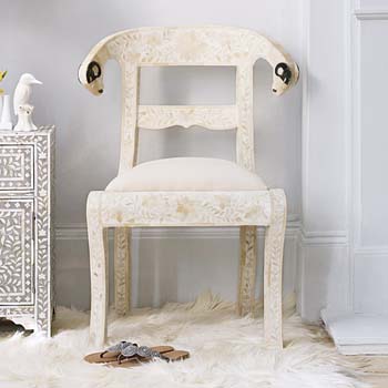 This striking ram’s head chair is part of the Bone Inlay Collection, which has been beautifully hand crafted in India. Individual pieces of reliably sourced camel bone have been skilfully carved and then affixed in to resin in an intricate floral design on to the wooden chair frame. The chair features ram’s head detailing on the ends of the arch back of the chair, elegantly curved legs and a padded seat which has been upholstered in 100% white cotton.