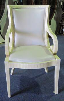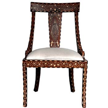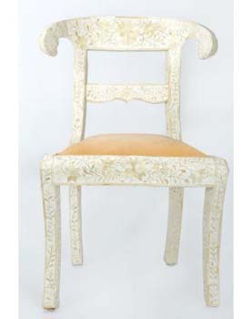 A traditional Rajasthan bone inlay chair is subtly updated with a simplified pattern, fresh colors with a quality linen seat cushion.This striking ram’s head chair is part of the Bone Inlay Collection, which has been beautifully hand crafted in India. Individual pieces of reliably sourced camel bone have been skilfully carved and then affixed in to resin in an intricate floral design on to the wooden chair frame. The chair features ram’s head detailing on the ends of the arch back of the chair, elegantly curved legs and a padded seat which has been upholstered in 100% white cotton. |